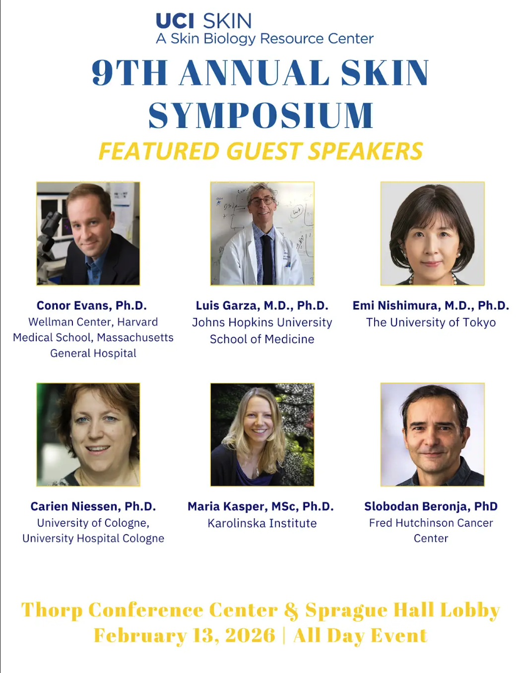 As a major visible program throughout campus, we continue the day-long Annual Symposium on Skin Biology and Disease. This annual event started with a symposium supported by the Stem Cell Center, on Clinical Translation of Stem Cell Approaches to Skin Biology and Disease in 2015. In 2017, through additional support from the Department of Dermatology and corporate sponsors, we were able to continue with the yearly Skin Symposium. The symposium is attended by 100-150 people from all areas of Southern California, from Los Angeles to San Diego. The next symposium will be held on February 13, 2026, with the following speakers.