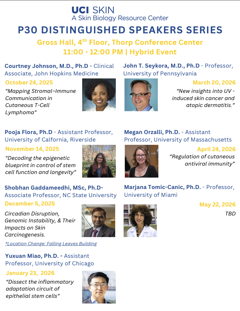 We sponsor 7-10 monthly lectures over the year, including several from distinguished scientists in skin biology/disease from outside UC Irvine. These lectures are coordinated with the Department of Dermatology Grand Rounds to enable these speakers to additionally present a lecture to the more clinically-oriented Dermatology Faculty. This program brings in leading skin biologists for the benefit of the Center research community and the skin disease community at UC Irvine.